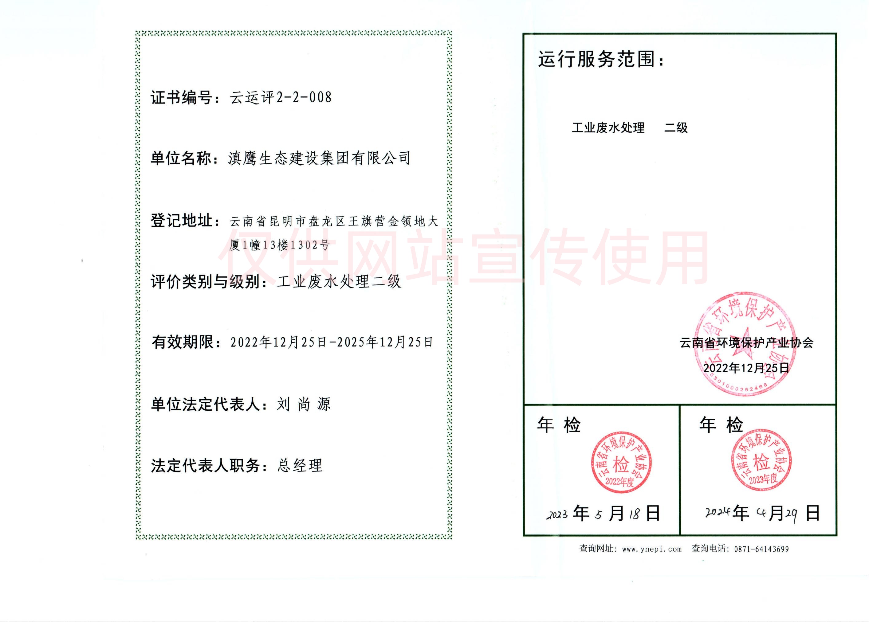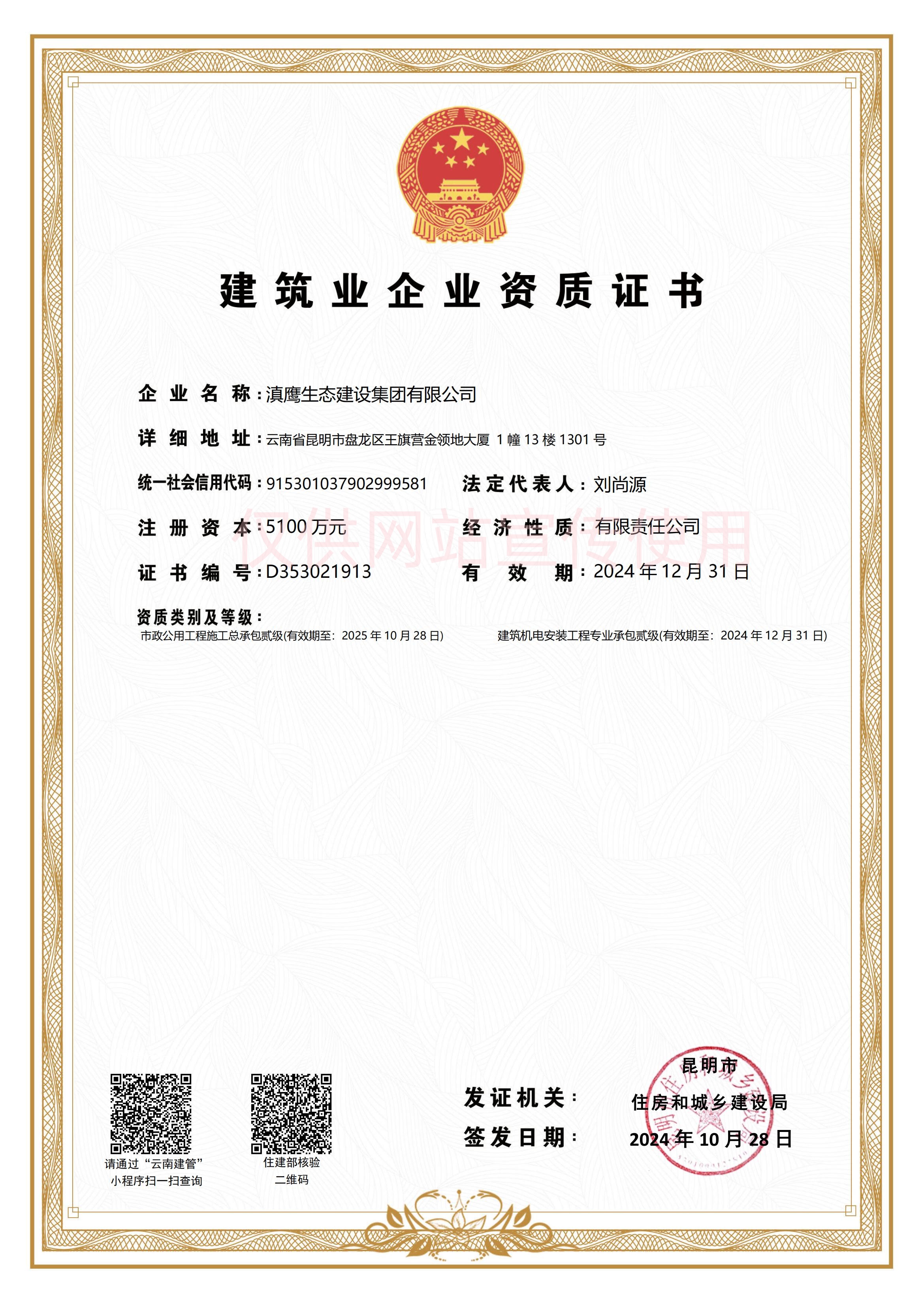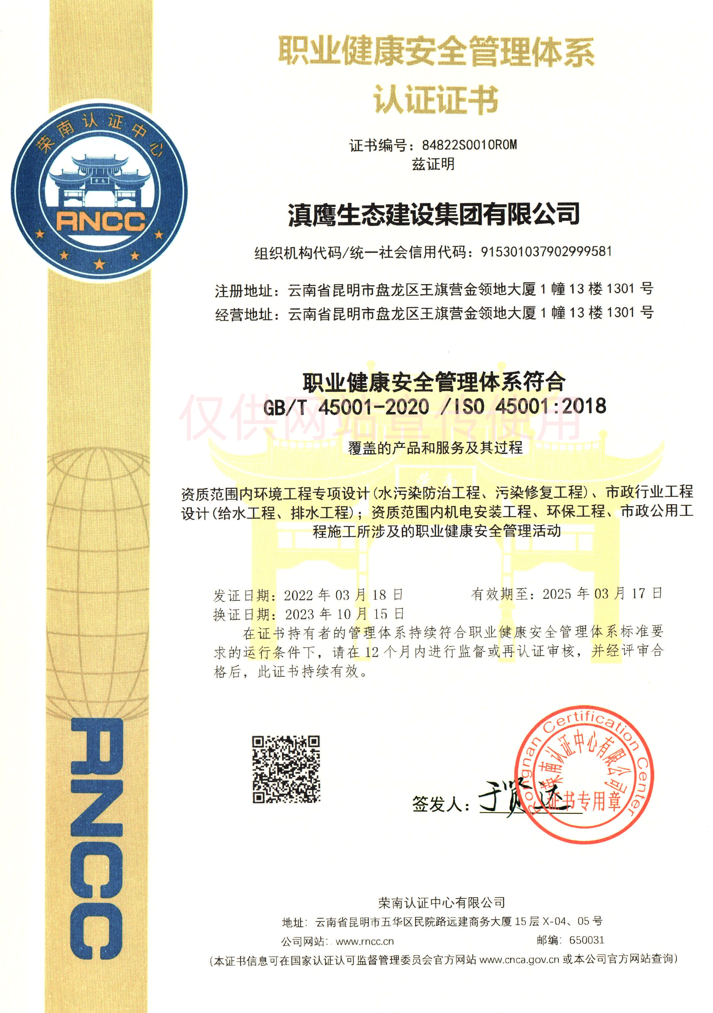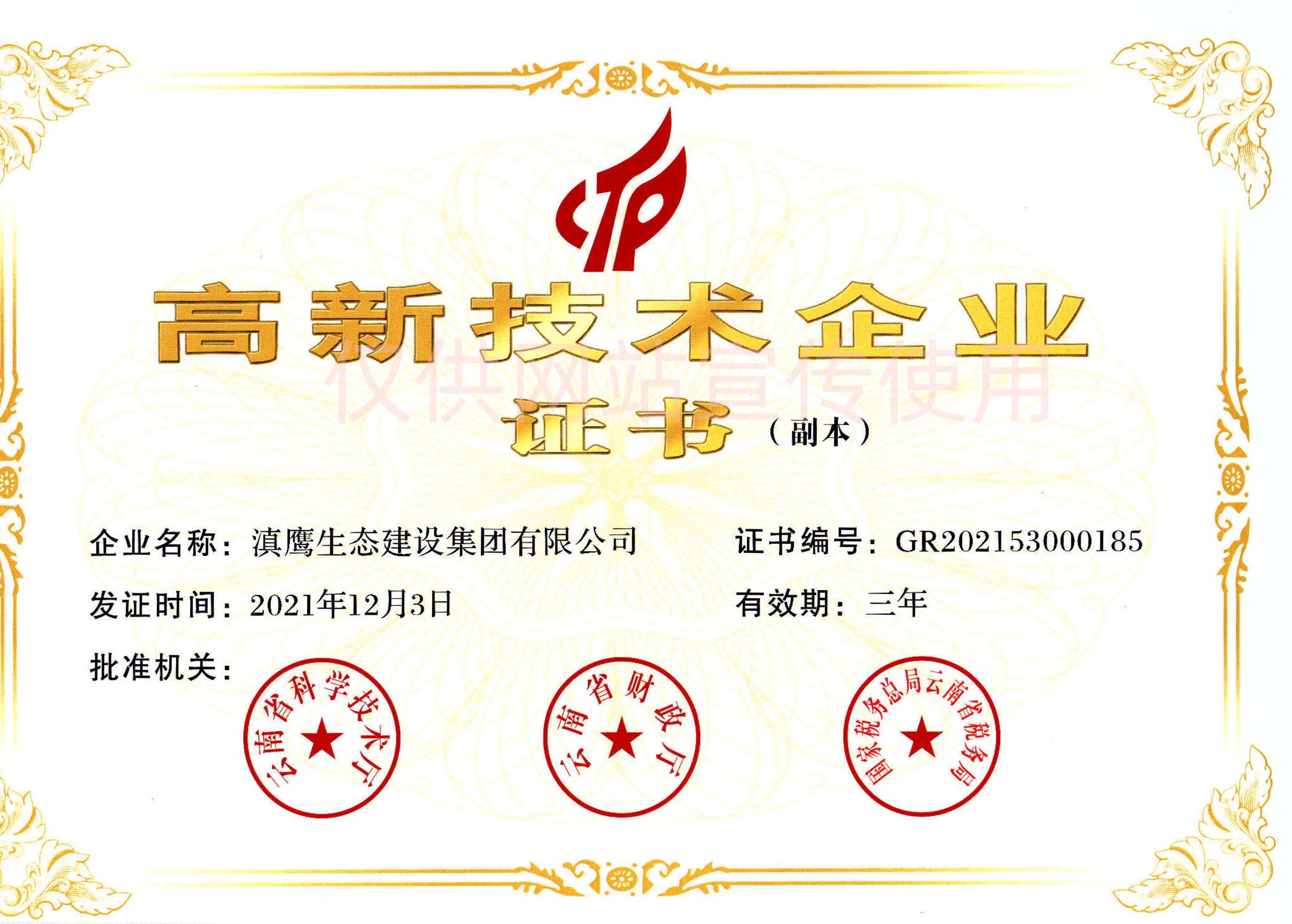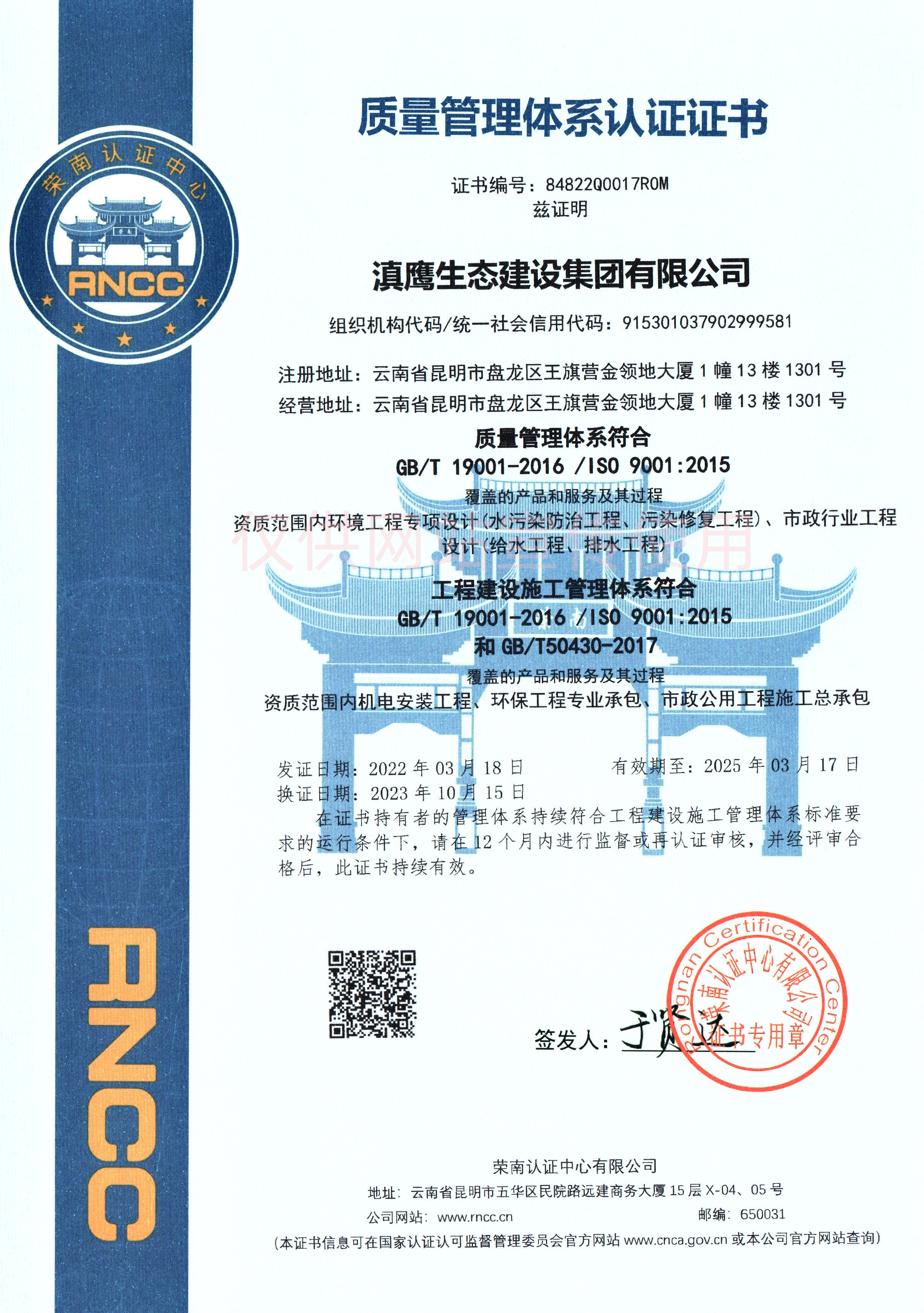 滇鷹生態(tài)建設集團以雄厚的技術(shù)力量、先進(jìn)的經(jīng)營(yíng)理念,濃厚的企業(yè)文化,不懈的創(chuàng )新精神,迅速發(fā)展成為生態(tài)環(huán)保行業(yè)中最具影響力的企業(yè)之一。集團具有工程咨詢(xún)資質(zhì)甲級、環(huán)境工程設計資質(zhì)、市政行業(yè)工程設計資質(zhì)、環(huán)保工程專(zhuān)業(yè)承包壹級資質(zhì)、市政公用工程施工總承包貳級資質(zhì)、環(huán)境污染治理甲級資質(zhì)、污染治理設施運營(yíng)資質(zhì)等,并榮獲“國家高新技術(shù)企業(yè)、國家級科技型中小企業(yè)、云南省“專(zhuān)精特新”中小企業(yè)”、昆明市企業(yè)技術(shù)中心、云南省掛牌企業(yè)等榮譽(yù)稱(chēng)號。