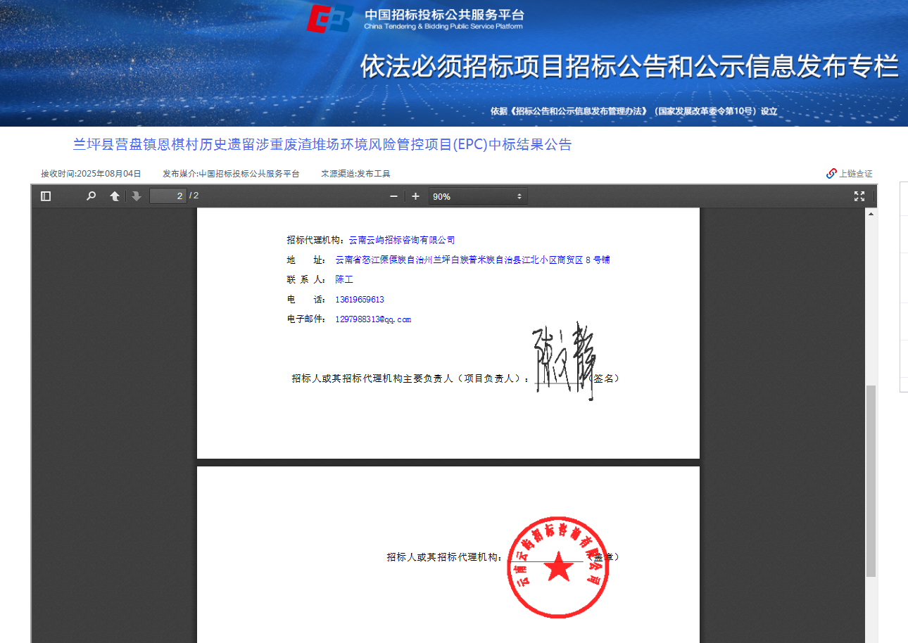 2025年8月4日滇鷹生態(tài)建設集團有限公司中標“蘭坪縣營(yíng)盤(pán)鎮恩棋村歷史遺留涉重廢渣堆場(chǎng)環(huán)境風(fēng)險管控項目(EPC)”